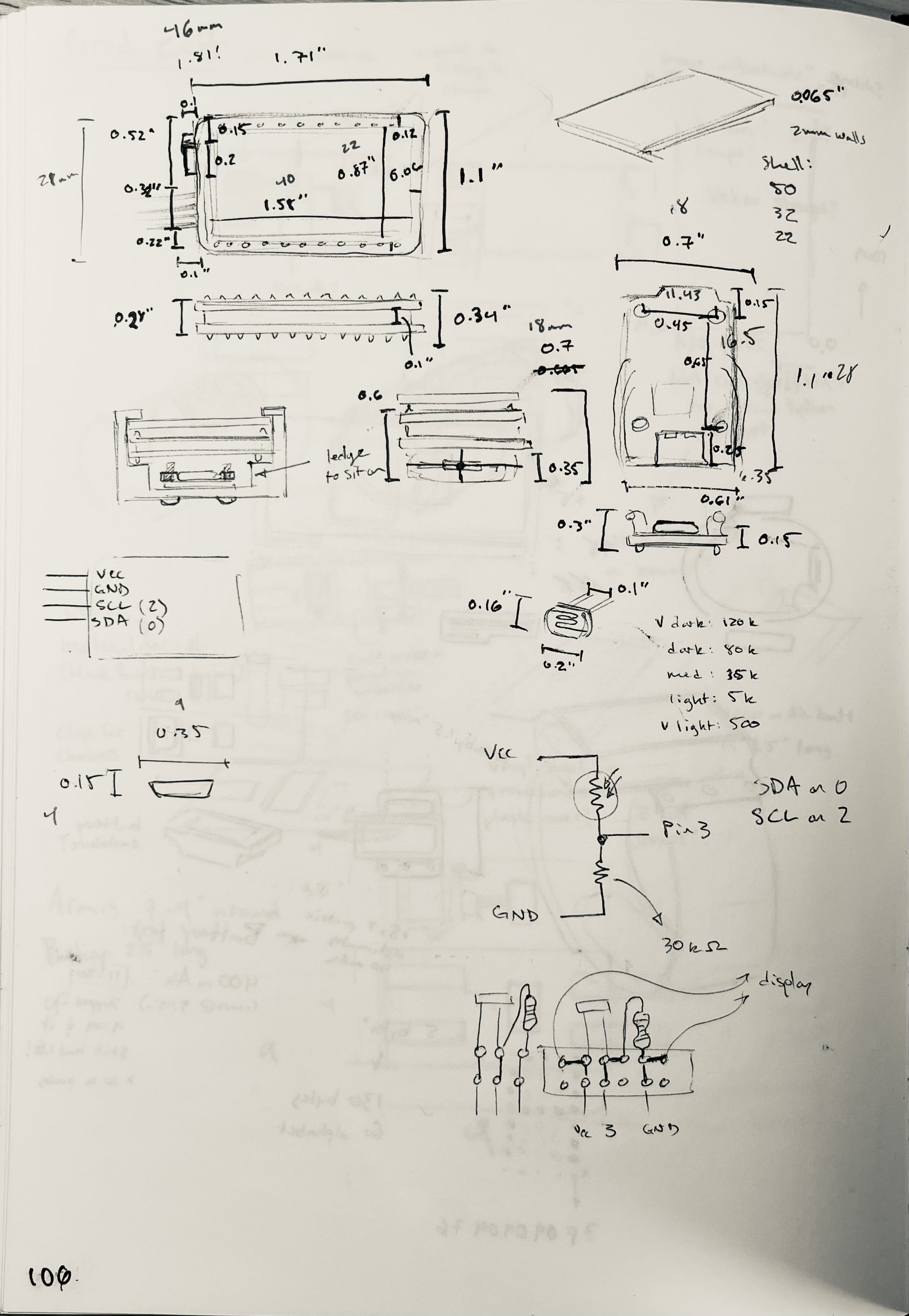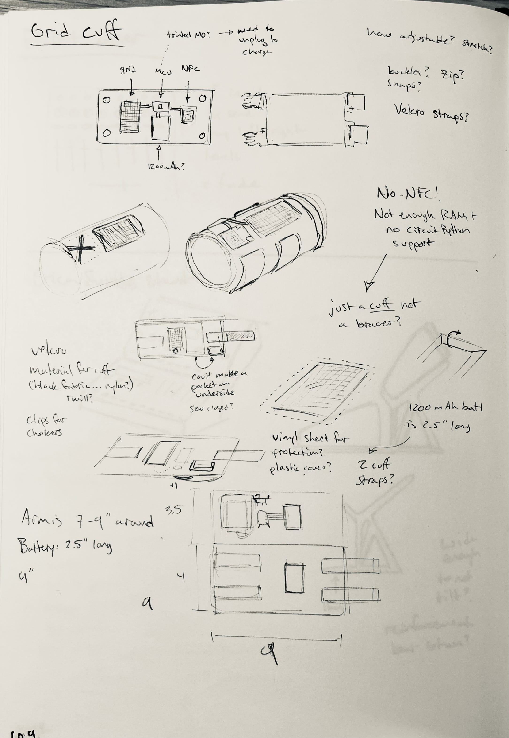 I decided the microcontroller would live under the LED matrix, and the battery would be tucked into a small pocket on the bottom of wrist strap, with a cable wrapping around under the strap. You can see a side-on diagram of the wrist strap in the fourth sketch.