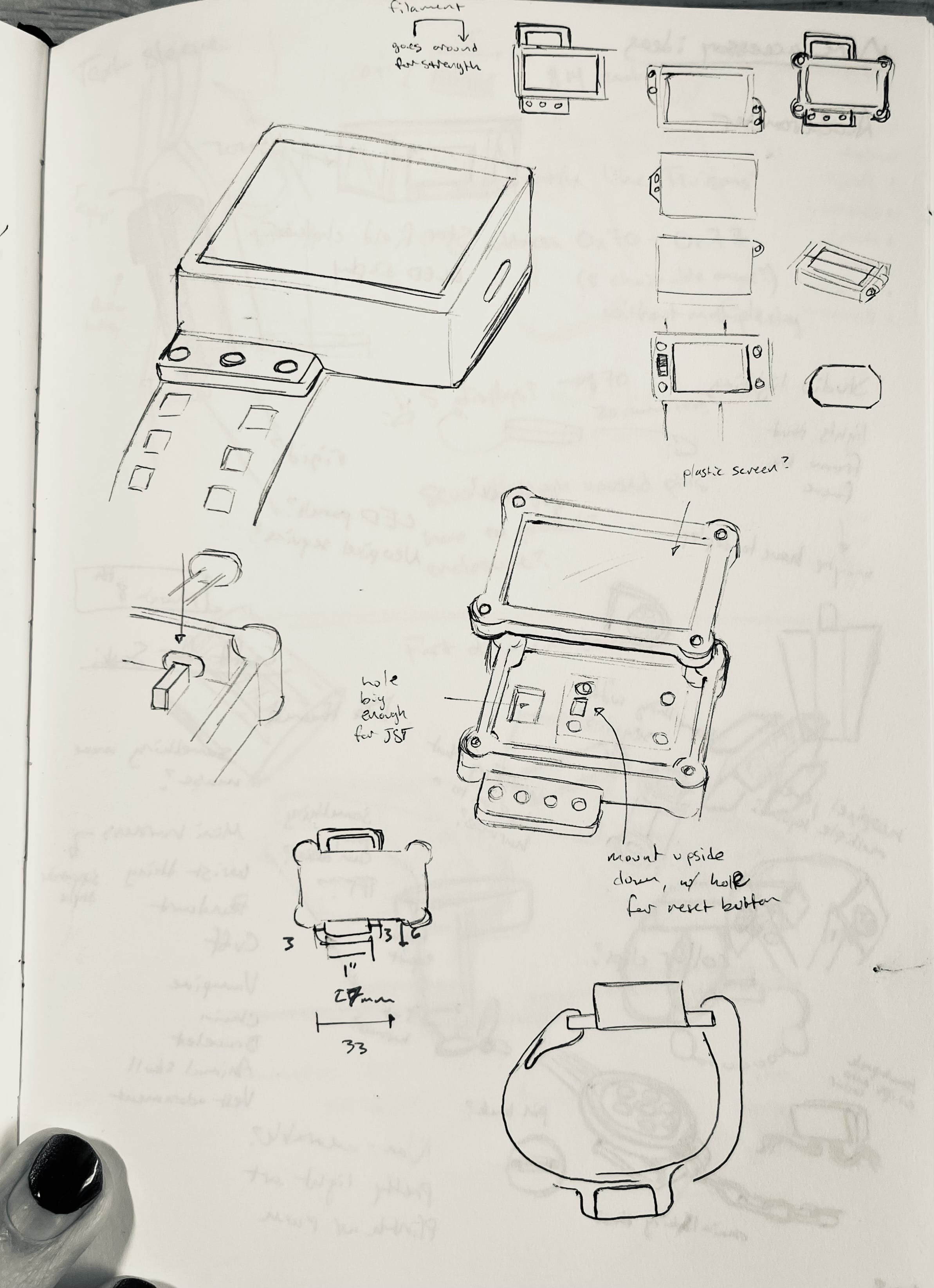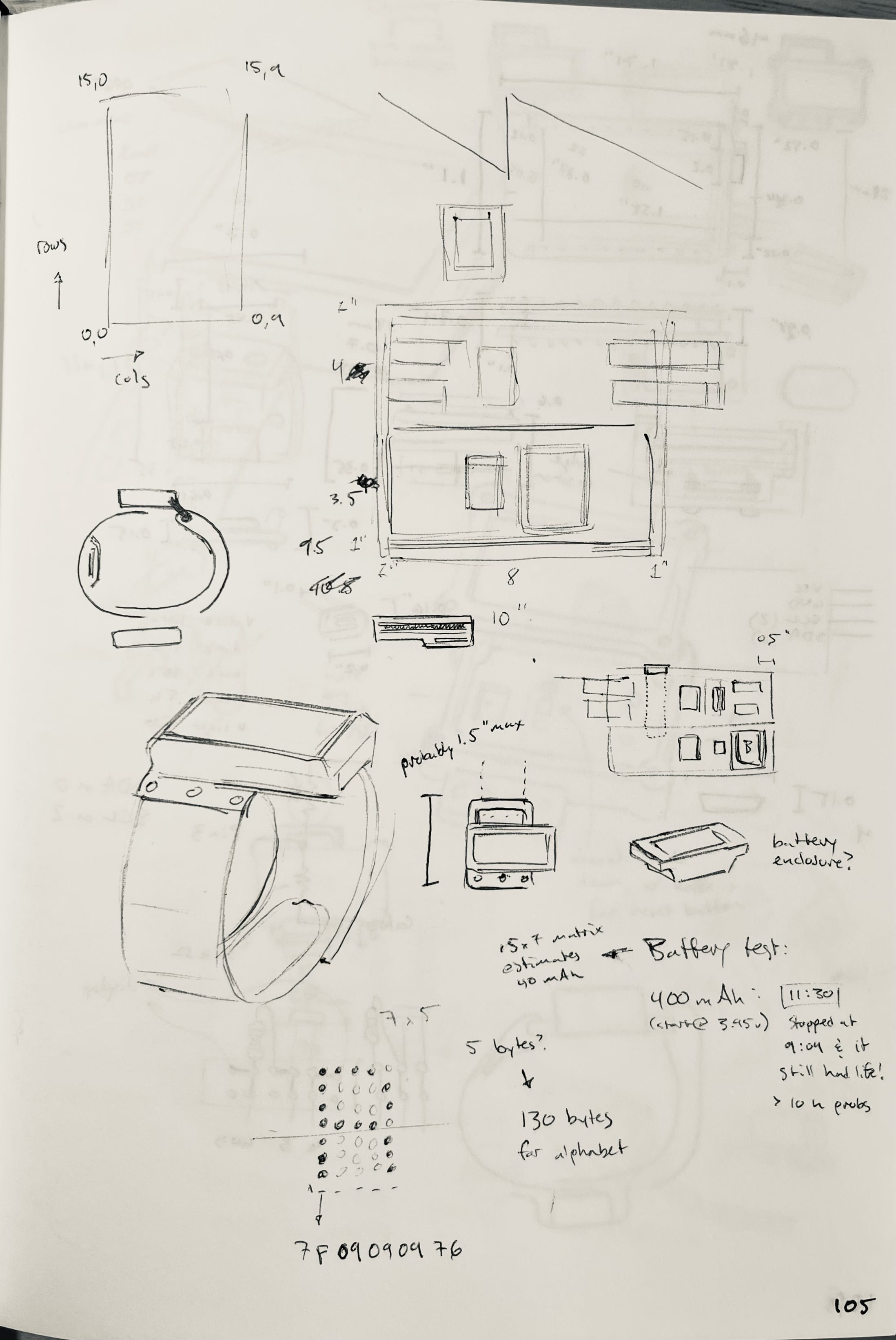 I did a bunch of sketching for this an even prototyped a few different versions of the wearable part. My first thought was to make some kind of sleeve or bracer, and I sewed a prototype version of this, but it came out looking like a cast or RSI brace. Later I settled on this watch-style form factor with the LED matrix extending off to the side.