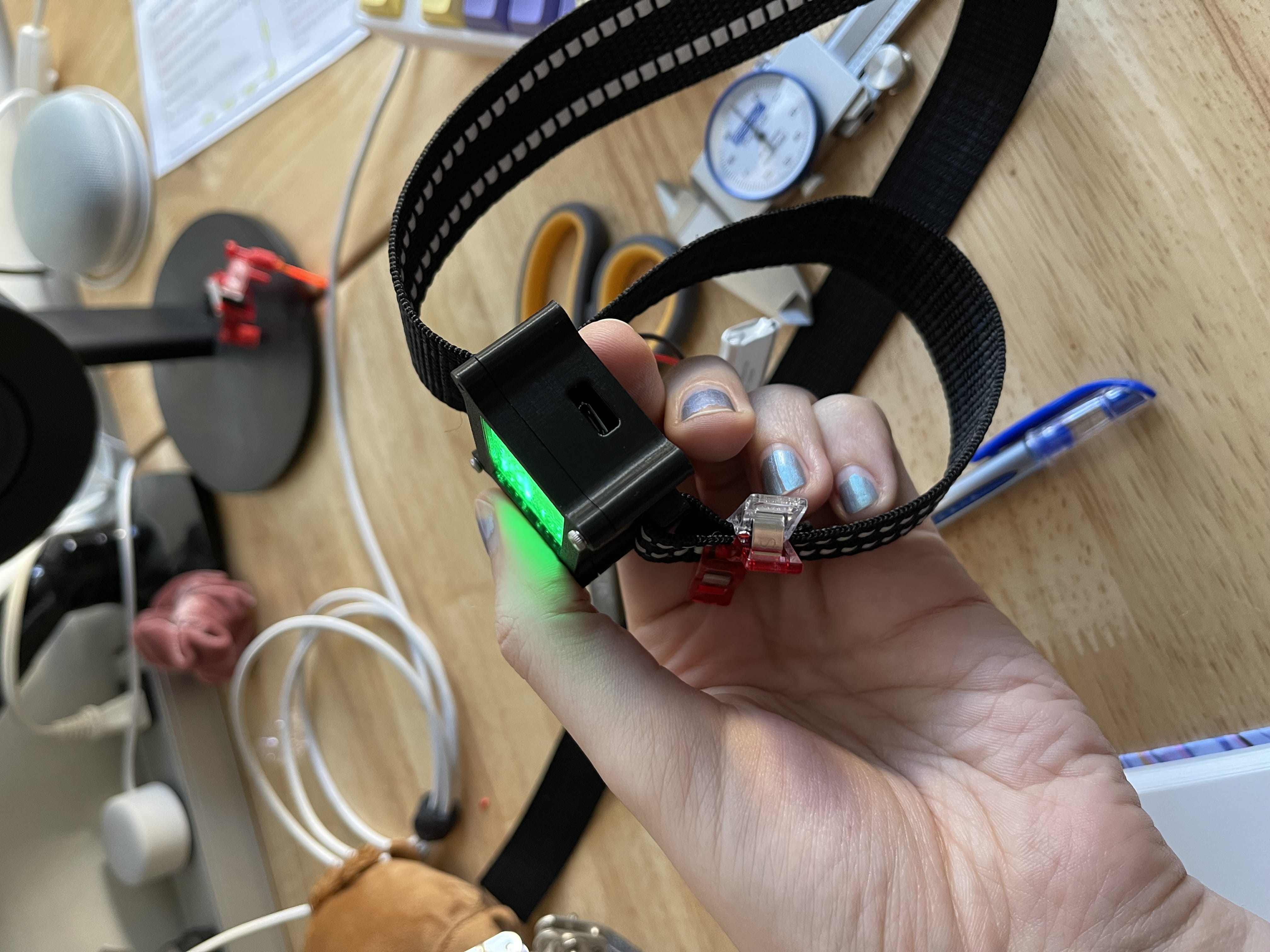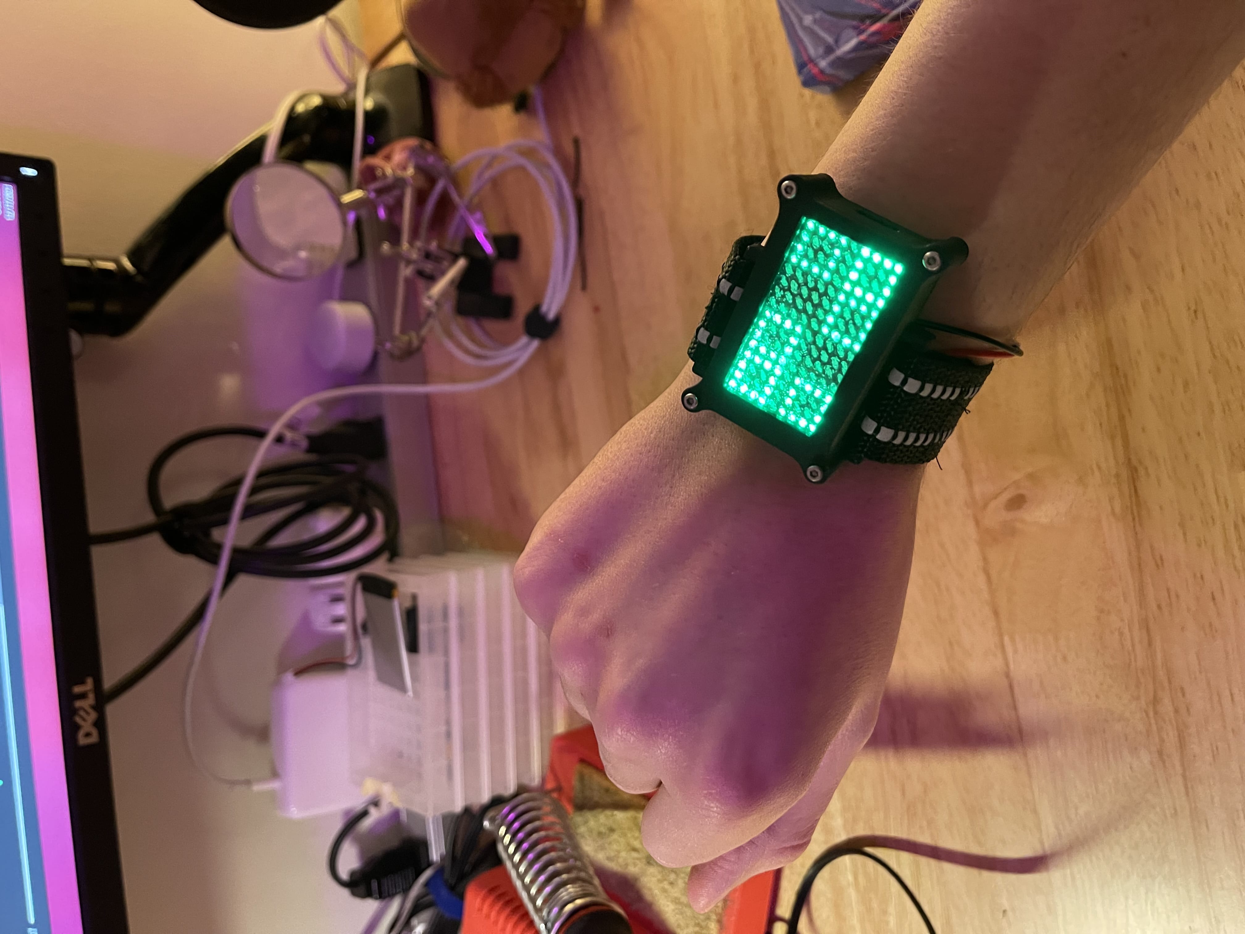 Here's the final result! It's pretty fun, and I love the no-button, hands-free interface. I wish the pattern animations were a bit smoother, and it feels a bit chunky for serious wear. Overall, a very fun and successful experiment though!