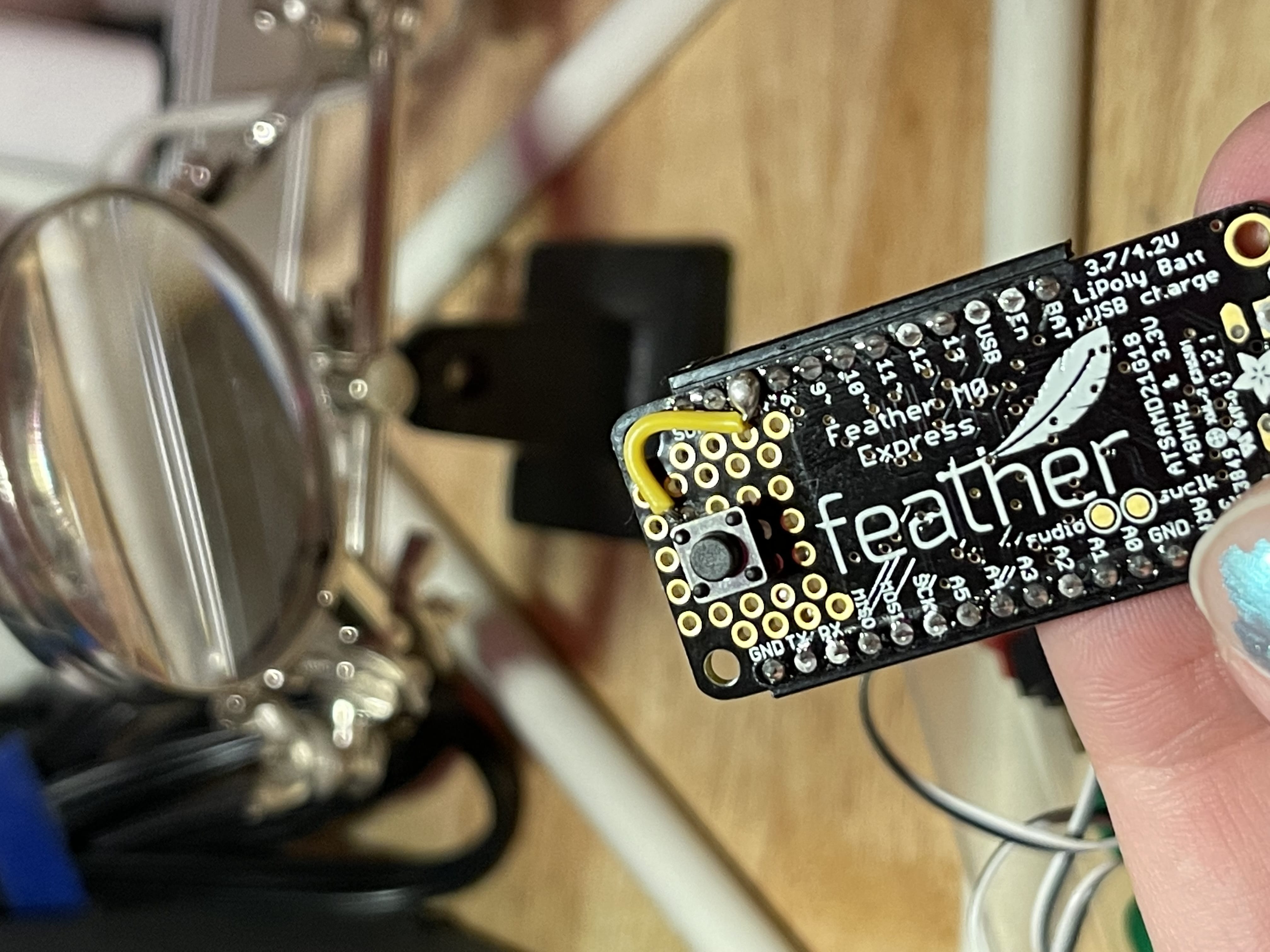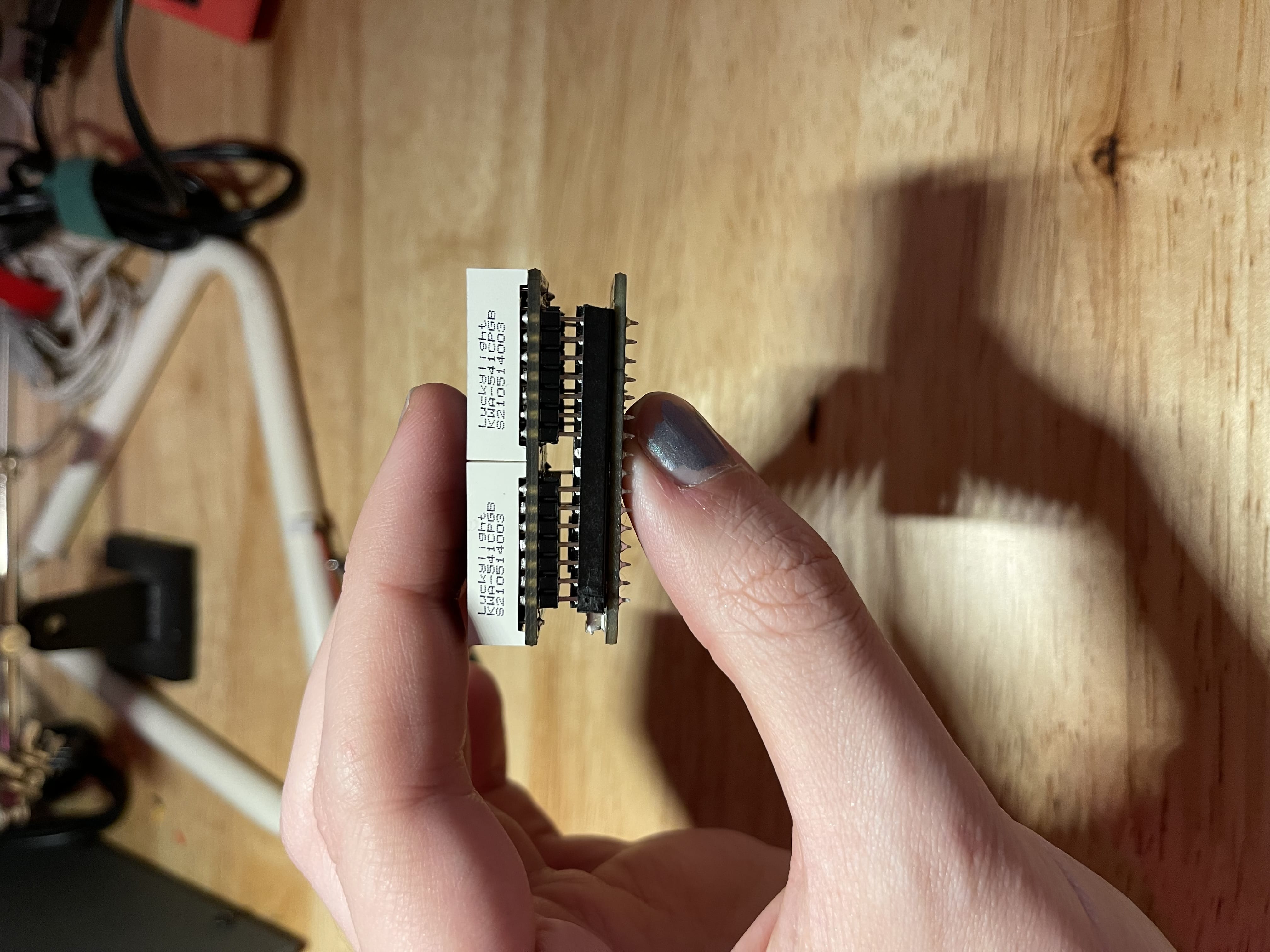 FeatherWings are designed to connect directly to Feather boards, like the M0 express I was using here. However, size really matters for a wearable! Using a typical set of headers and pins would have left extra space between the two layers, which would make it stick out from the neck in a cumbersome way. To make the full module as slim as possible I cut the sides off of an IC socket (which is a little shorter than standard headers), and I trimmed down the pins on the FeatherWing. This was quite tedious but helped a lot!