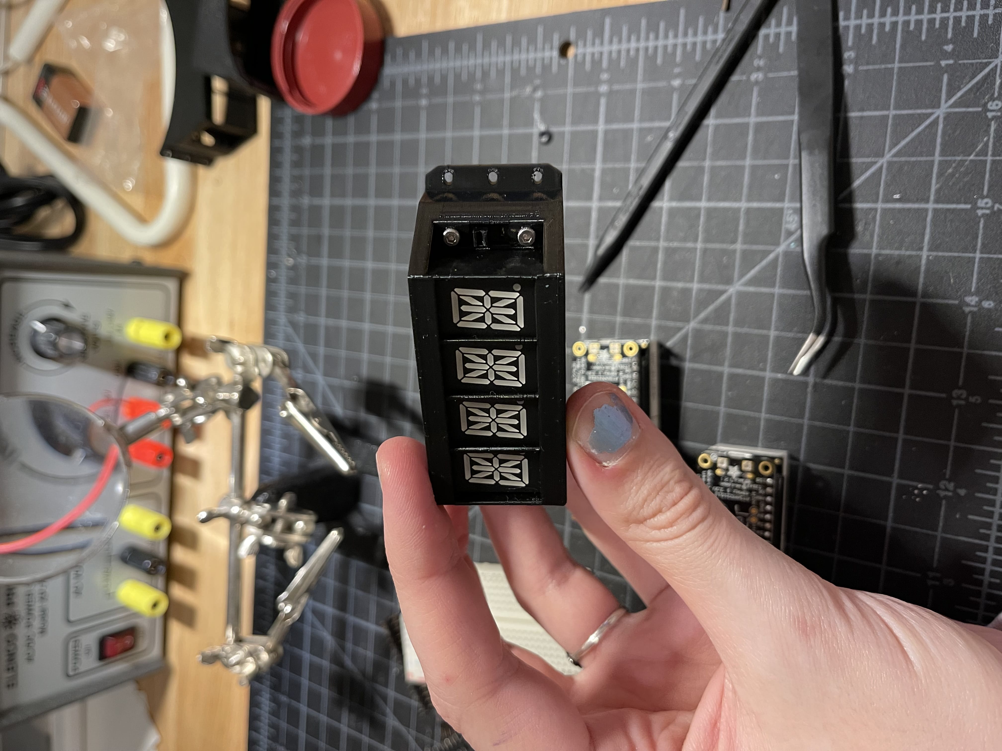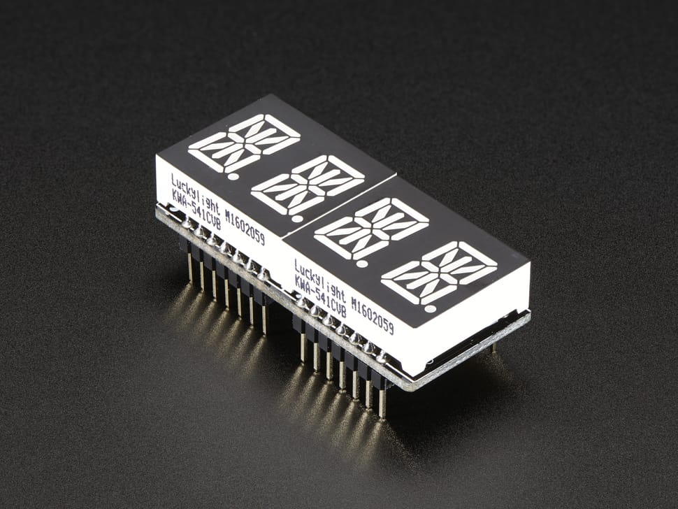 After building the cyberdemon choker, I wanted to experiment more with this format, but explore a programmable display. The Adafruit Feather microcontrollers have accessory boards called FeatherWings, and there's a ton of them! Including this one with a 14-segment alphanumeric display driver that can control four digits.
