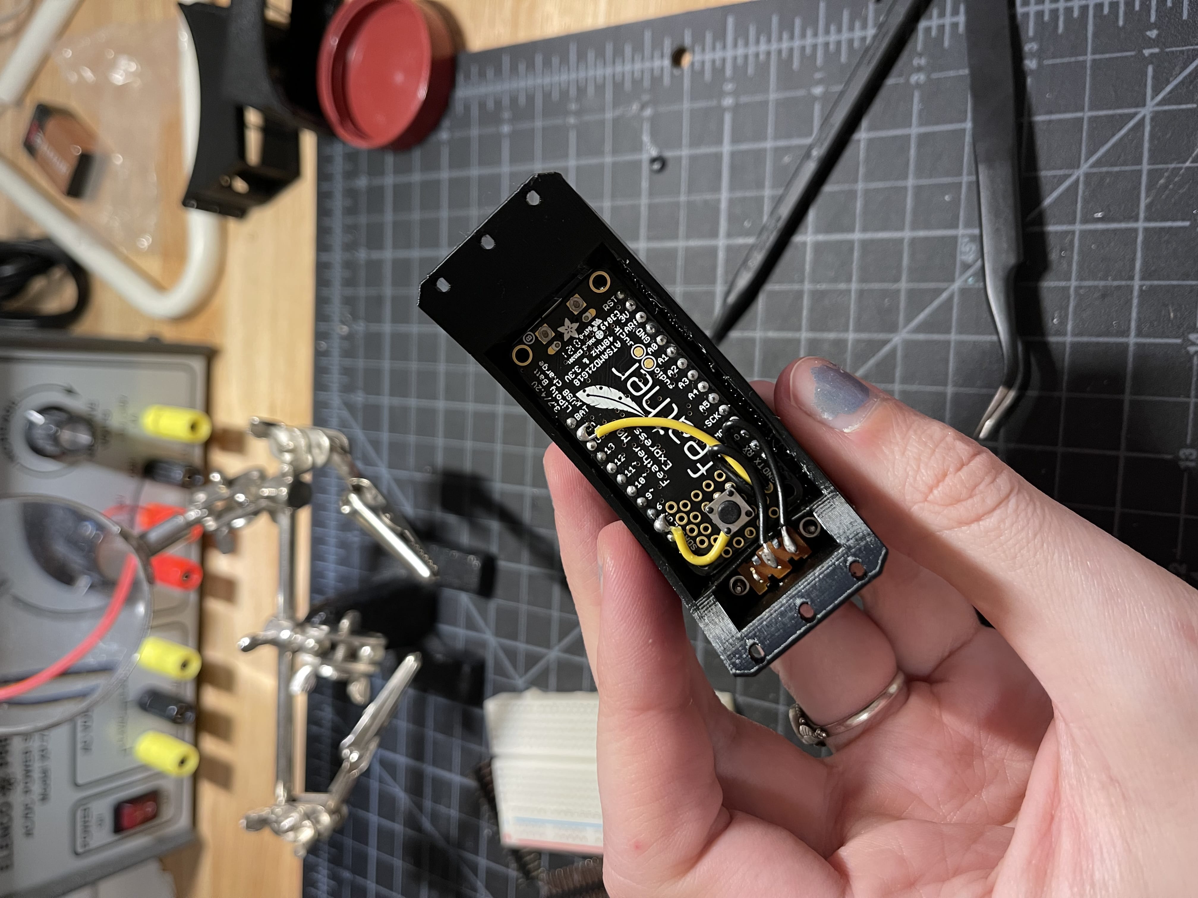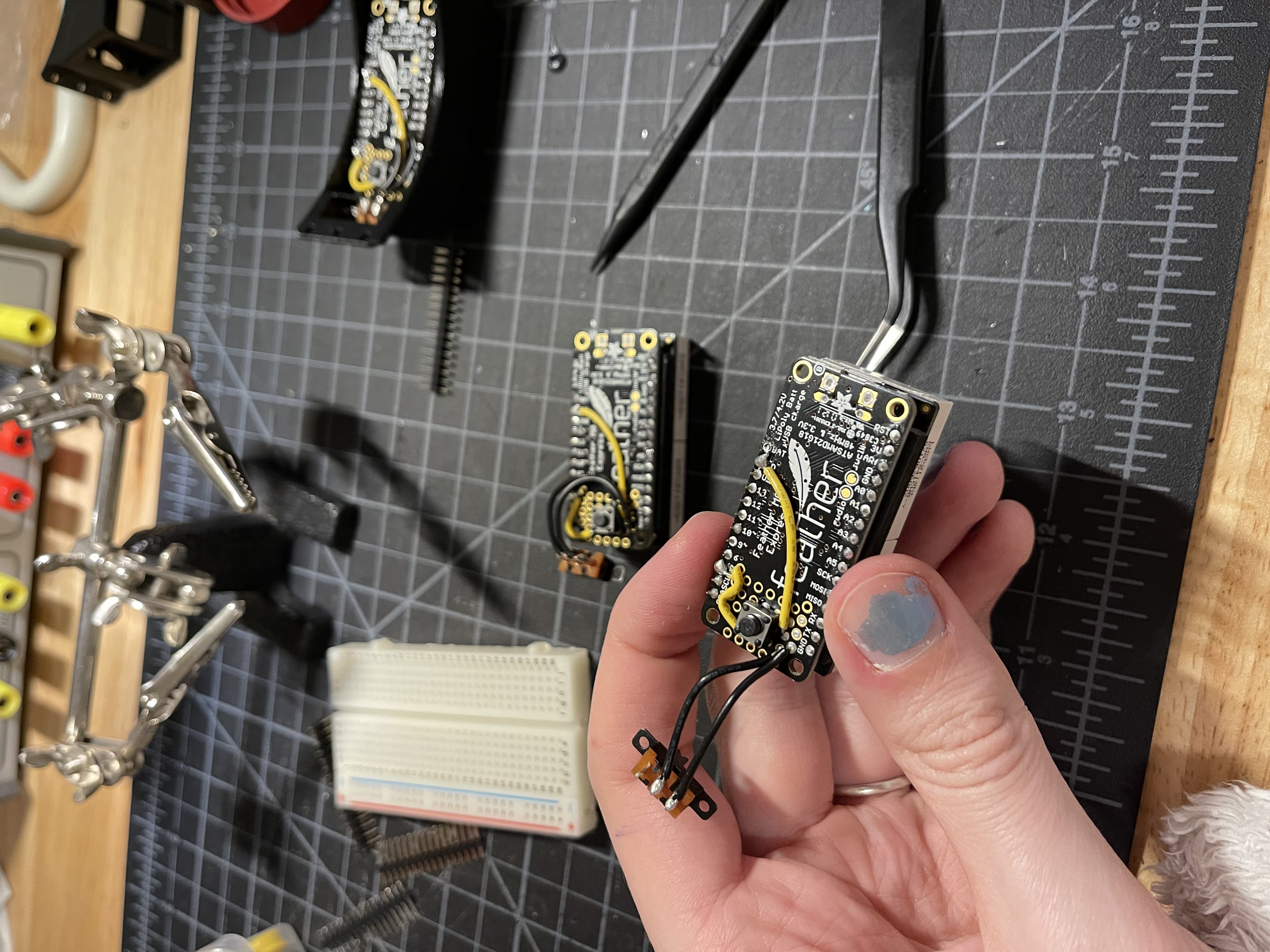 Anyway — the Feather M0 Express also has a small area for prototyping circuits, and I managed to squeeze in a button to switch between different pre-programmed messages. I also added a power switch that just connects the Enable pin to GND to shut the microcontroller off. And now we're ready to test!