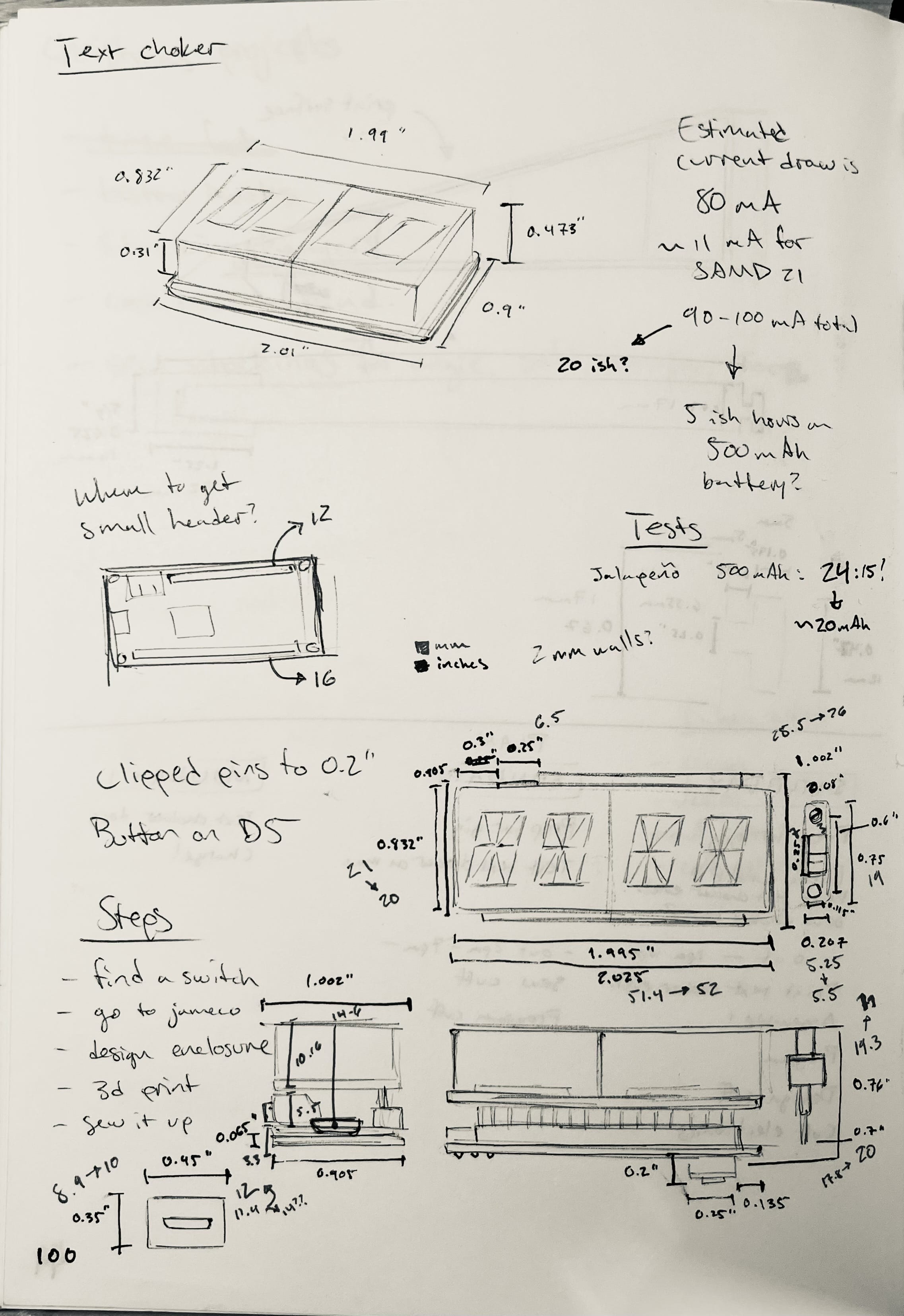 With the basic code working, I wanted to move on to the rest of the choker part. I made a 3d-printed enclosure to protect the circuits and provide some mounting holes I could use to sew it onto the neck strap.
