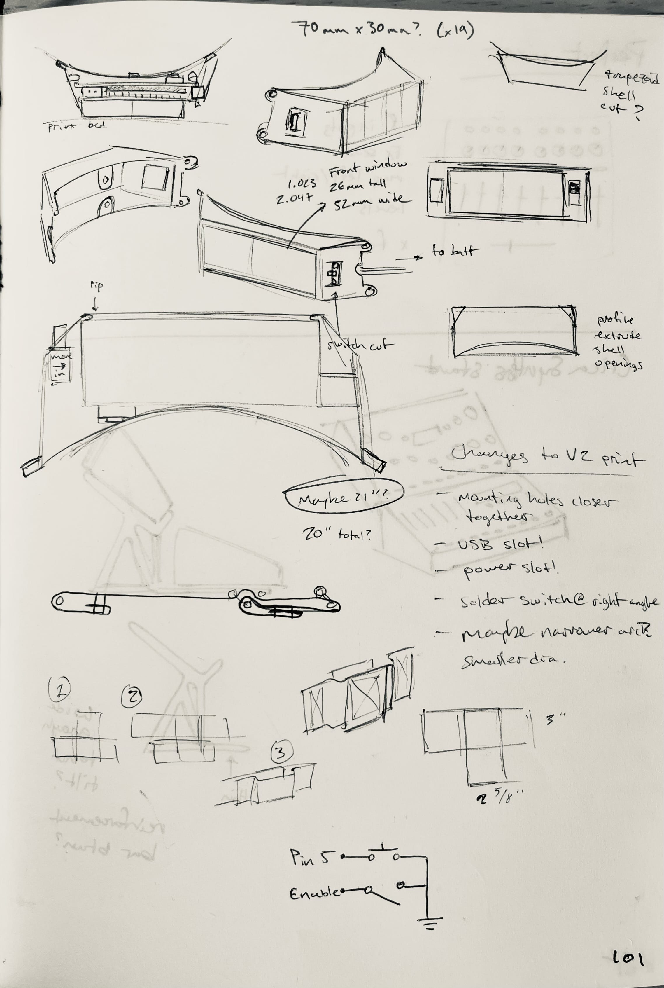 You can see my rough plan for the strap design in the sketch on the right above, but in reality it was a lot of trial and error and testing and tailoring.I used a buckle at the back with a big easy button that's easy to pop when you want to take it off. You can see the battery pocket on the left side in these videos too. It has an exposed wire, but... I don't dislike it. The unit on the front is a bit chunky, but since it's under your chin it's actually a little less noticeable than you would expect.