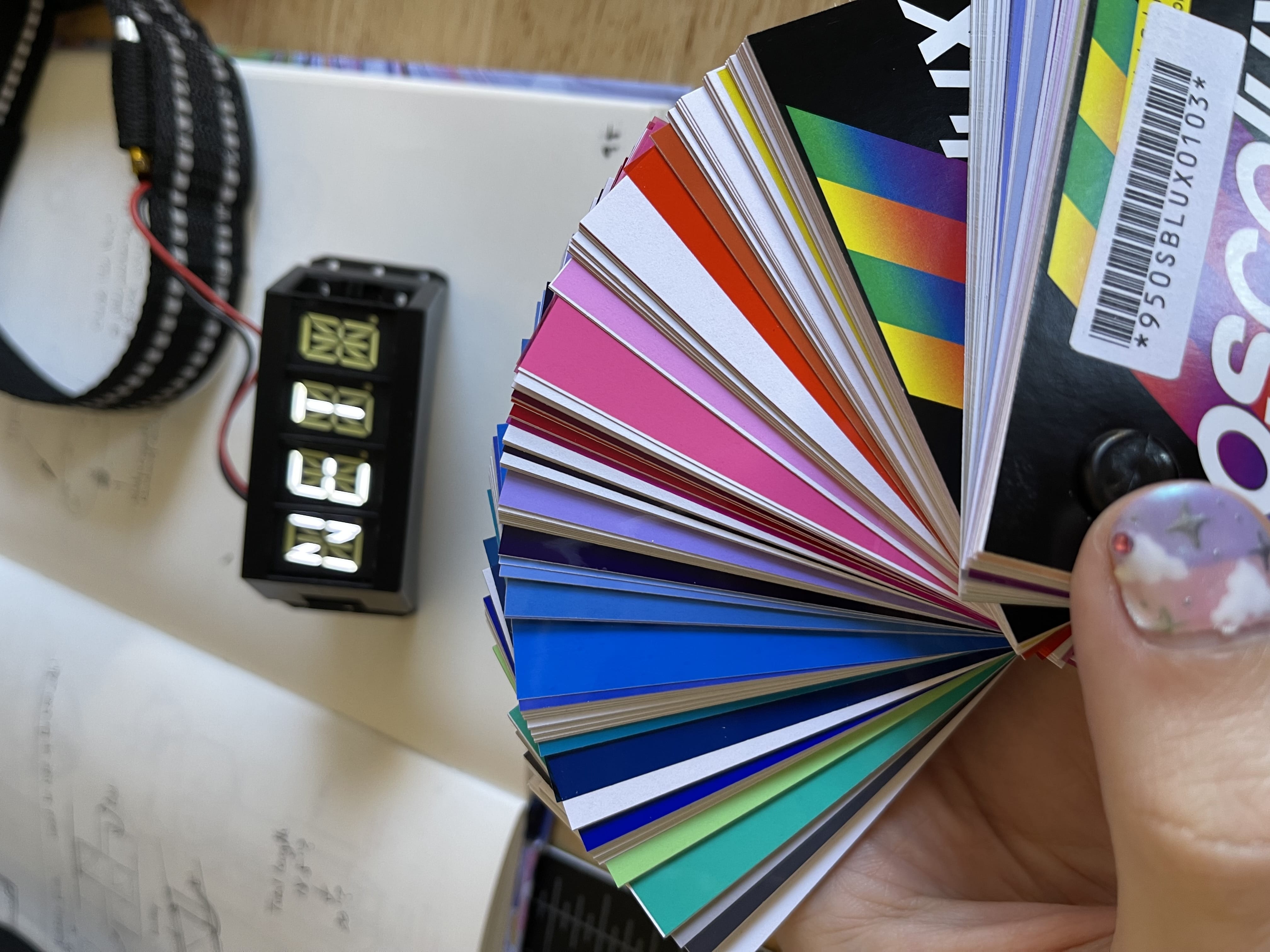 I was a lighting designer in the theater program in my highschool, and I remembered having a swatch book of colored lighting gels. I figured the little samples might be about the right size to insert in front of these little displays, so I ordered a swatchbook and a few white LED versions of the alphanumeric FeatherWing.