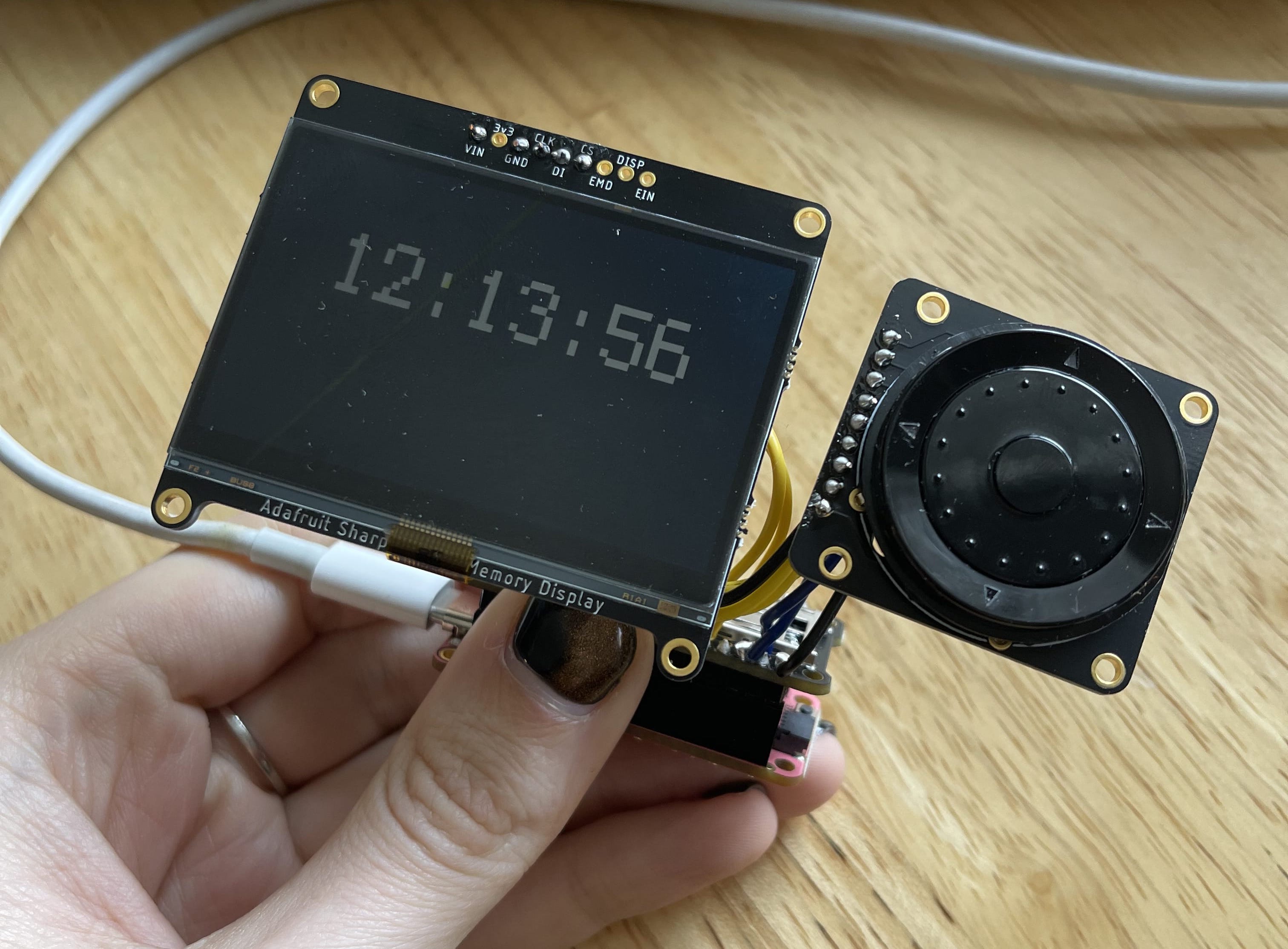 I stacked up the feather and the adalogger with headers, then soldered in a clickwheel for switching modes (I wanted to design a few different options for displaying the time), and the display. A bit of example code from the adafruit learn guides got the time up and running!