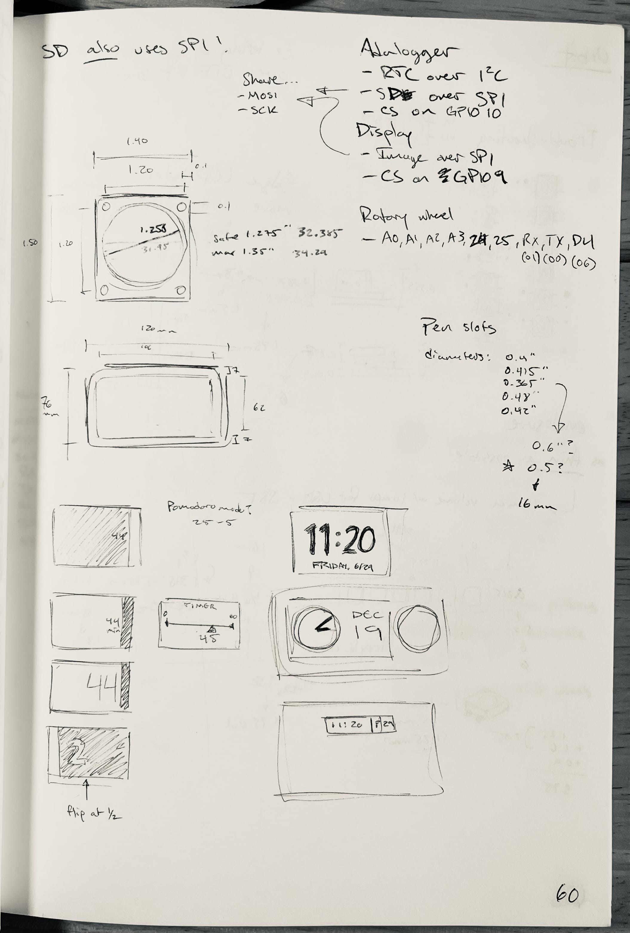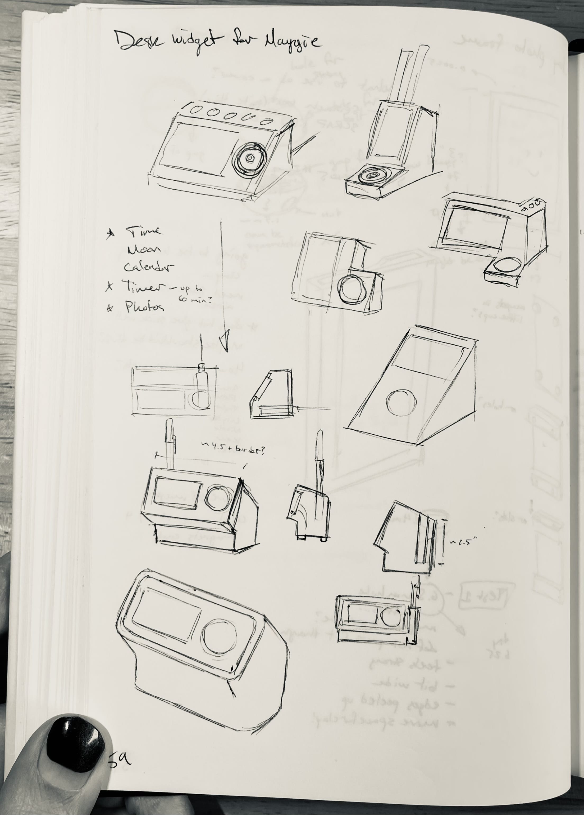I sketched out a few ideas, but ultimately I liked the idea of orienting the screen sideways for an overall shorter, wider design. I added some pen slots on the side, and gave the whole form a bent-over angled shape kinda like an upright Braun DN 40 alarm clock.