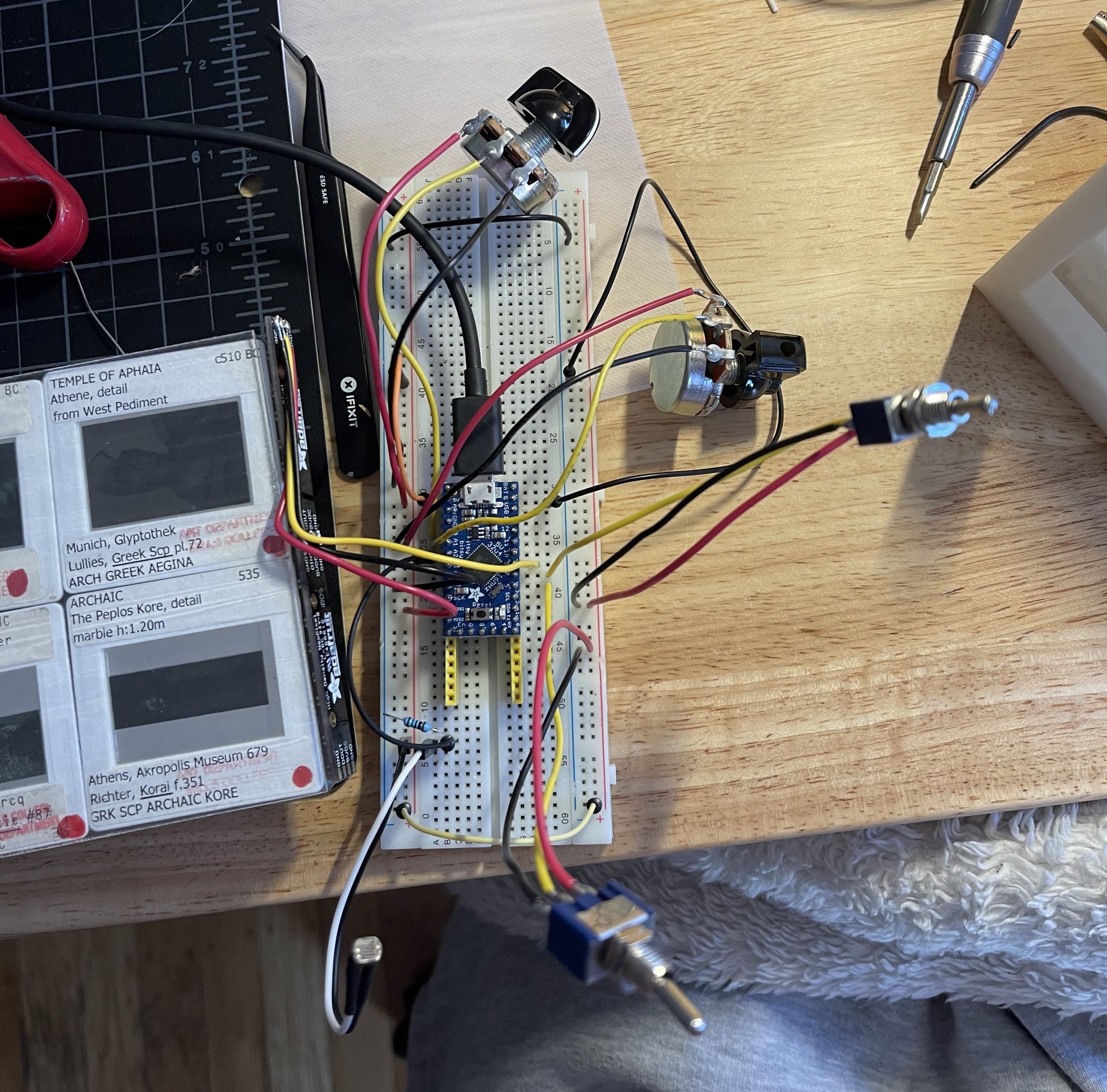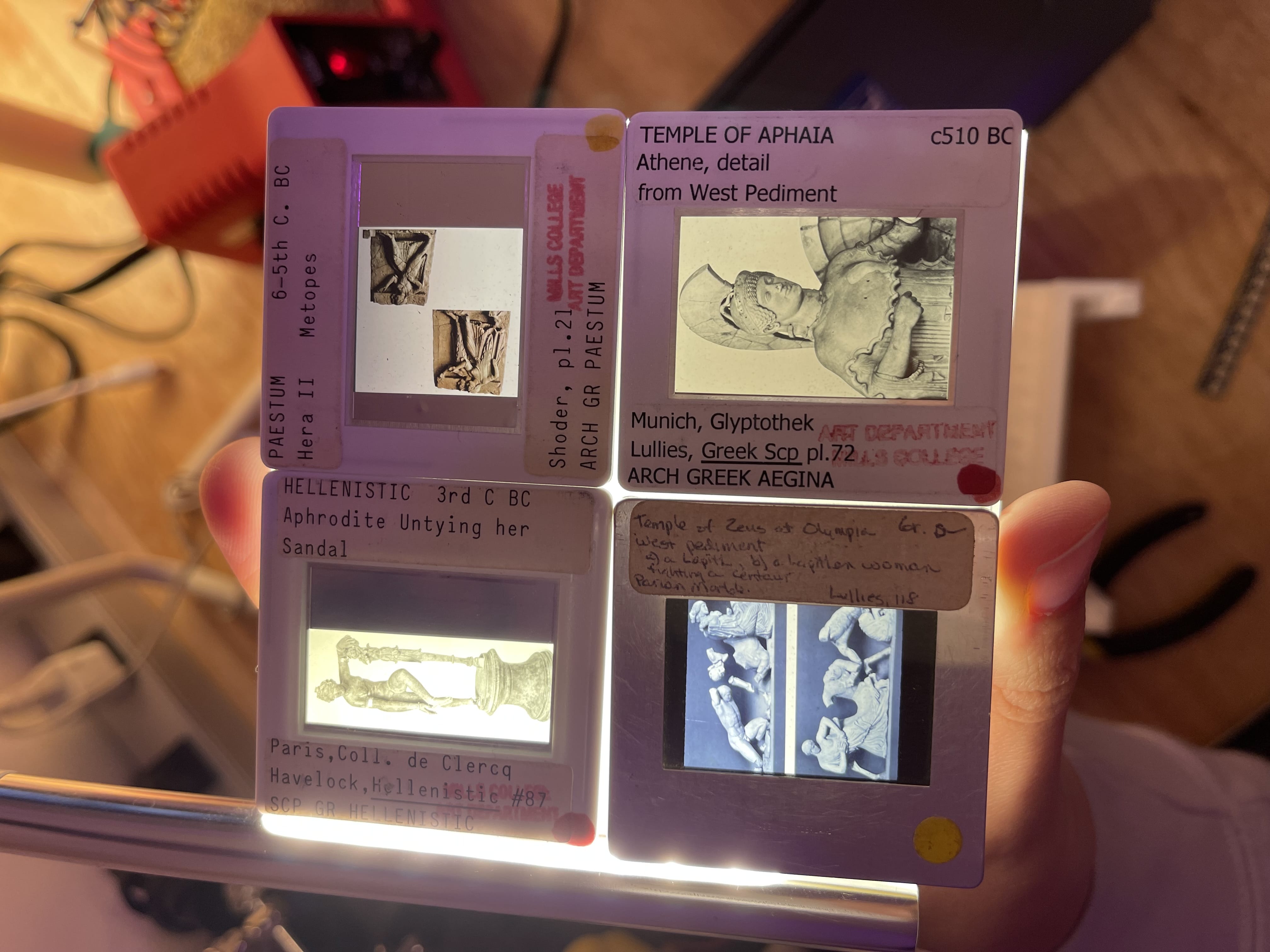 I was browsing around a local creative reuse center called SCRAP, that has just has bins and bins of... stuff... that you can purchase cheaply for fun projects. I found a big bin of projector slides from the Mills College art department, which included a bunch of awesome photos of greek statues. I found another bin with glass samples cut into 4"x4" squares, and whaddaya know, a 2x2 grid of tiles fits perfectly. I had the idea to add some LED edge lighting on the glass to create a backlight effect, which I tested quickly with the work lamp on my desk.