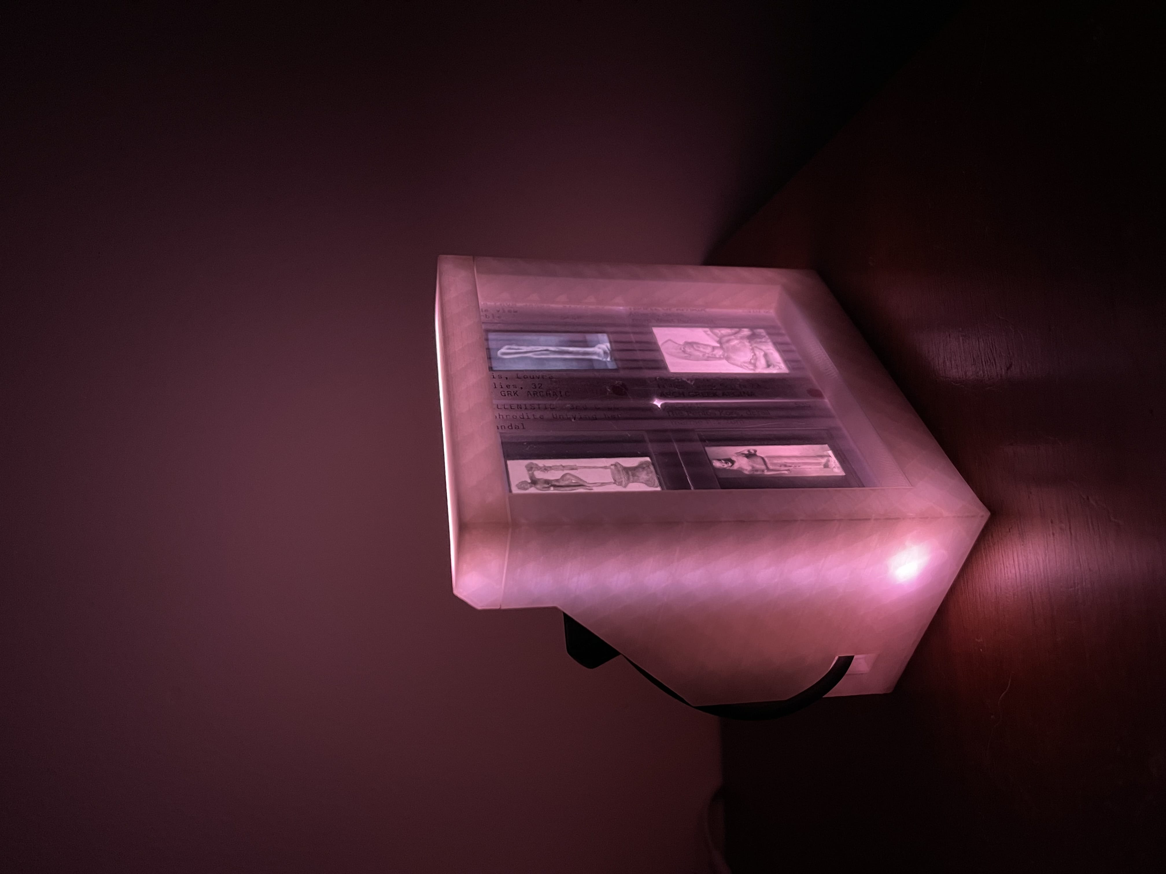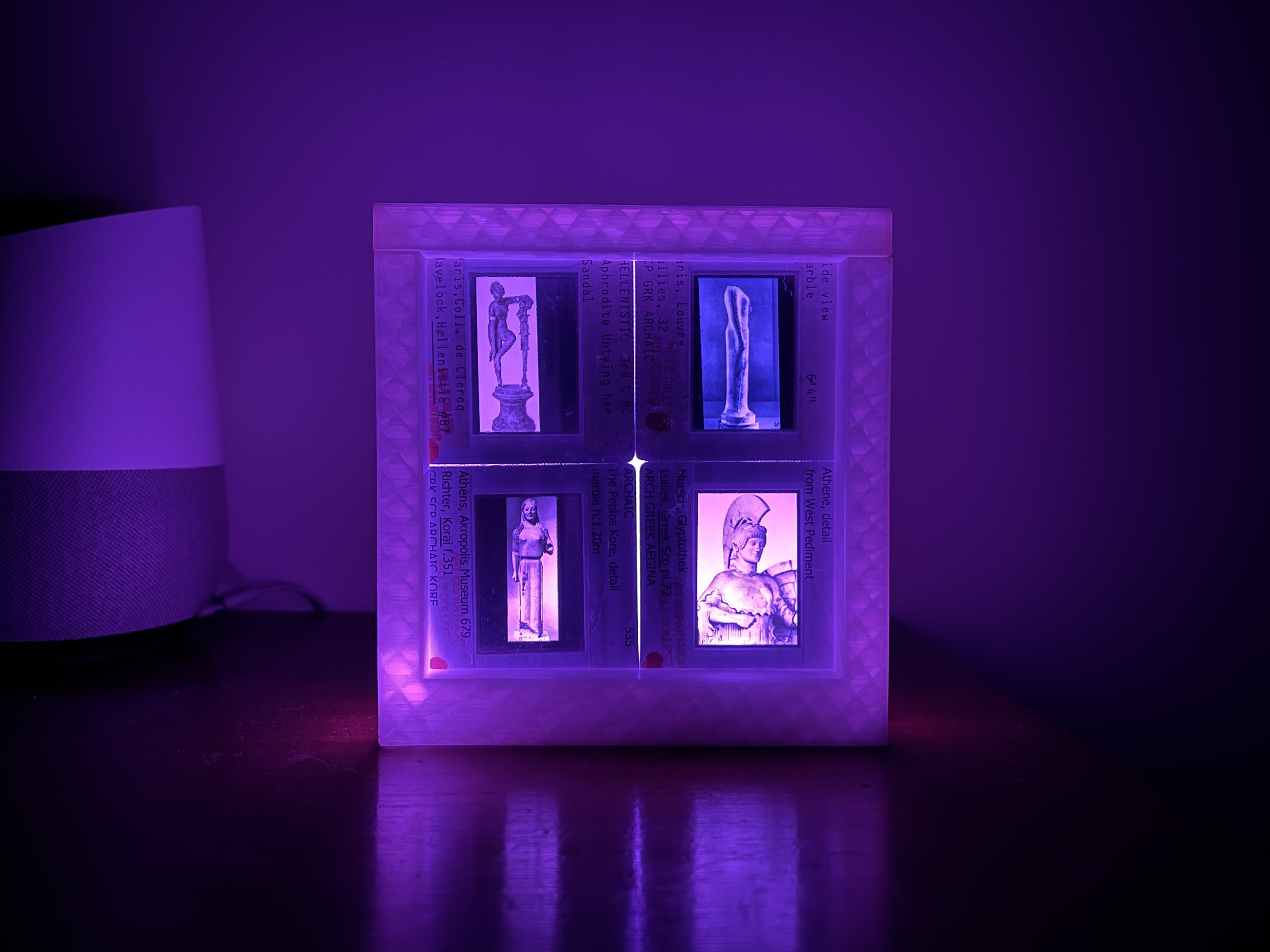 This is a lamp with a glass-and-LED backlight that can provide nice rear illumination for projector slides. On the back it has knobs for brightness and color, and a light sensor so it can turn on automatically when it gets dark, like a nightlight! In front of the slides is a thin piece of acrylic that has a ridged texture that lends the photos a bit of a pixelated appearance and breaks up the shapes a little.