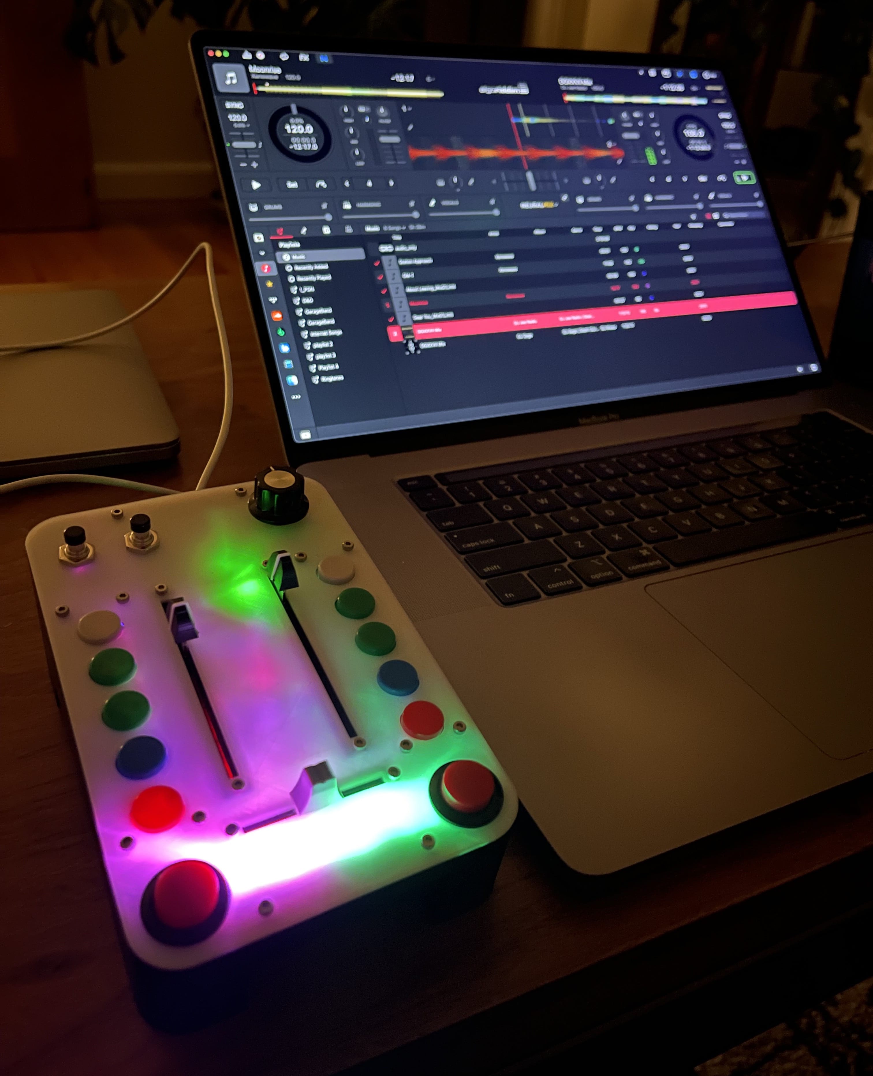My wife Maggie had a show called Hellmouth Radio on our friendly local internet radio station BFF.fm. She was using an app called Djay Pro to make playlists, and had to select, load, start, stop, crossfade, and adjust tracks while talking live on air. Djay has a nice interface, but sometimes it's nice to have a set of physical controls so there's less risk of a mis-click. So, I designed a mini DJ controller that controls all the basic functions of Djay using MIDI commands over USB!