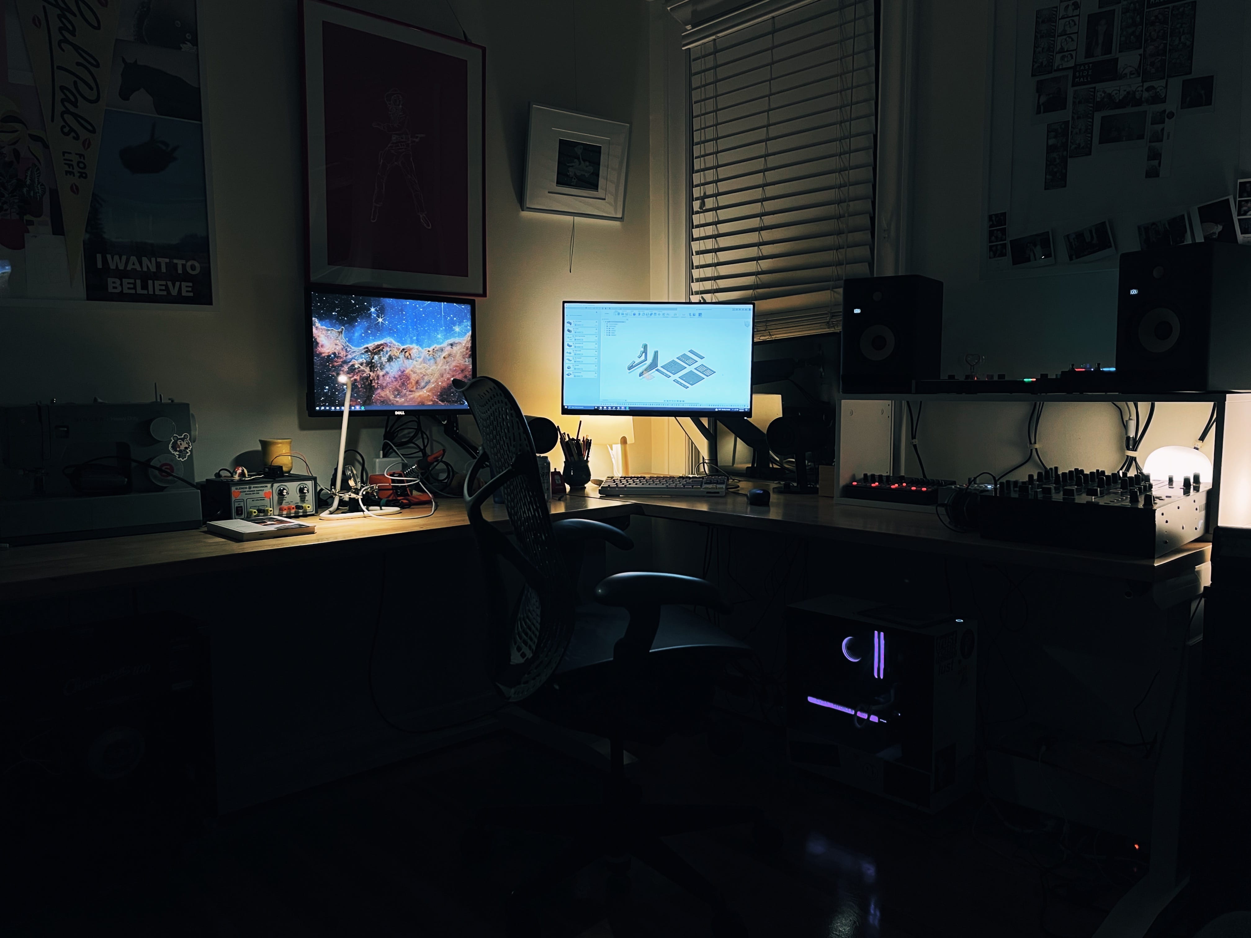 I'm fortunate to have room in my apartment for a creative space, which I've packed to the brim with tools and supplies. I've set up an electronics workbench, 3D printer, sewing machine, drum machines, DJ mixer… it's a full on makerspace / nightclub :)